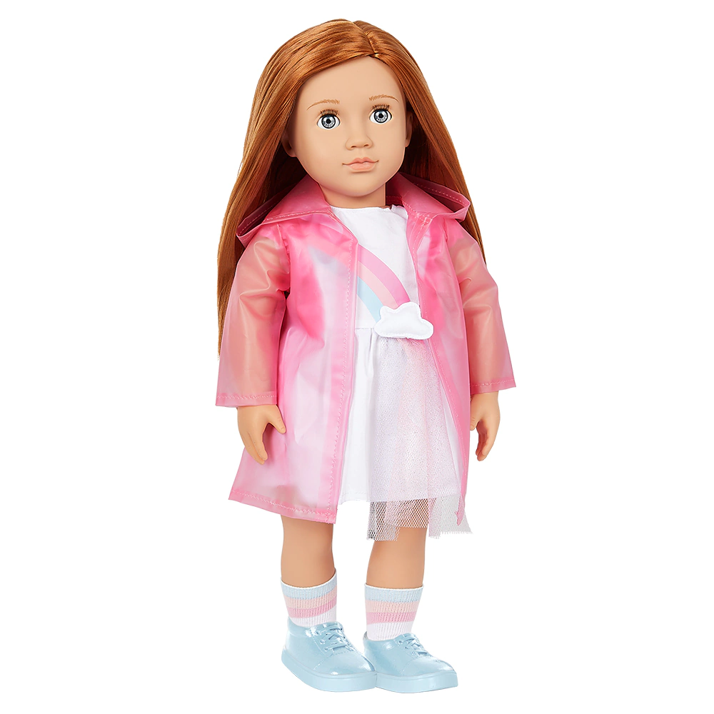 El súper lindo vestido arcoíris presenta detalles de volados, un colorido estampado de arcoíris y una nube decorativa con una bonita cinta de encaje para darle un toque extra de diversión. Completa el conjunto con calcetines a juego y zapatos elegantes cuando llegue el momento de viajar al aire libre. Luego, añade el elegante impermeable rosa para los días de lluvia. ¡Incluso tiene una capucha para proteger el peinado de tu mejor amiga!