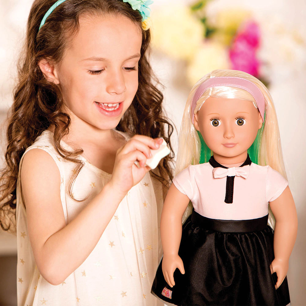 ¿Qué hace a Amya especial? ¡Le encanta el océano, jugar a la mancha y cambiar el color de su cabello con tiza temporal para el cabello! Amya lleva un hermoso y moderno vestido blanco y negro con cuello de lazo y una falda superpuesta transparente. Sus adorables calcetines de encaje con zapatos planos rosas son el toque final. ¡Usa las esponjas aplicadoras para aplicar uno de los tres colores de tiza para el cabello y darle a Amya una nueva apariencia! Su cabello rubio blanquecino es el lienzo perfecto para la tiza suave y dulce del cabello. Cuando sea el momento de cambiar su peinado, cepille suavemente la tiza y comience de nuevo.
