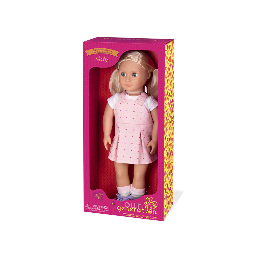 ¡El verano es más divertido con buenos amigos a nuestro lado! Naty tiene unos ojos azul verdoso únicos y un cabello rubio corto y liso con una trenza lateral. Su cabello sedoso es divertido de peinar. Viste un lindo look de verano con un vestido rosa cubierto con pequeños corazones brillantes. Debajo, ella usa una camiseta blanca, calcetines de rombos pastel y zapatillas rosadas con cordones de color lila.
