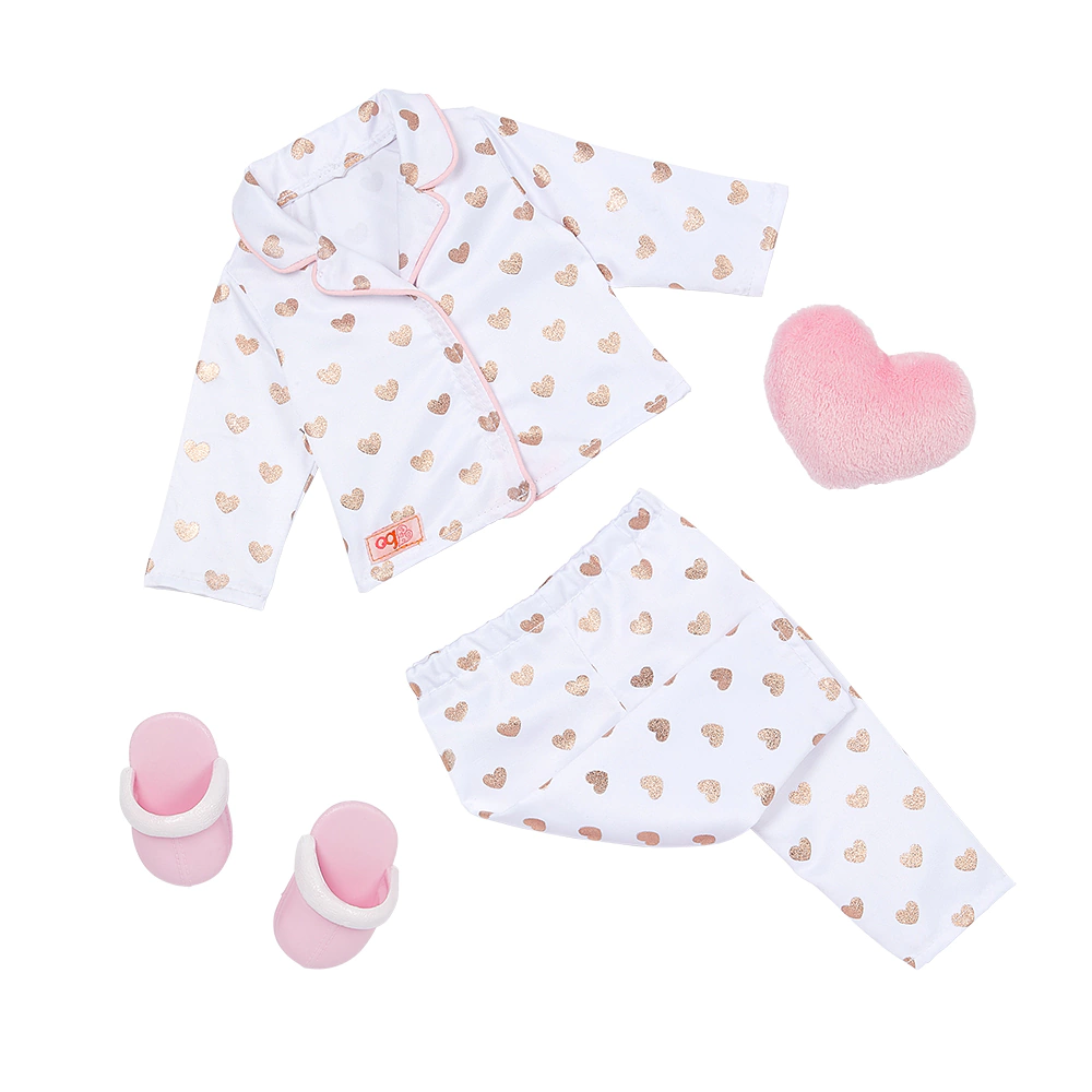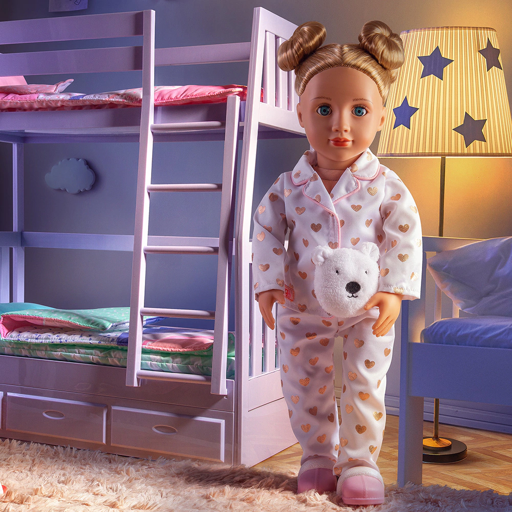 Serenity está lista para una fiesta de pijamas. Llega vestida con un pijama a juego con un patrón de mini corazones dorados y su almohada de felpa con forma de corazón favorita. ¡Y el lindo par de pantuflas la ayudarán a pasar de la cama a la mesa del desayuno! Su conjunto también cuenta con cierres de fácil apertura para ponerse y quitarse rápidamente, para que Serenity pueda mezclar, combinar y comenzar cada aventura con estilos divertidos.