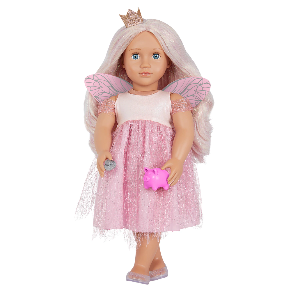 ¡Sueña historias mágicas con Tooth Fairy Twinkle! ¡Esta muñeca Our Generation de 46 cms tiene ojos azules brillantes que se abren y cierran, y su cabello largo y rubio brillante es muy divertido de peinar!